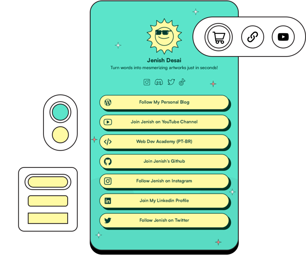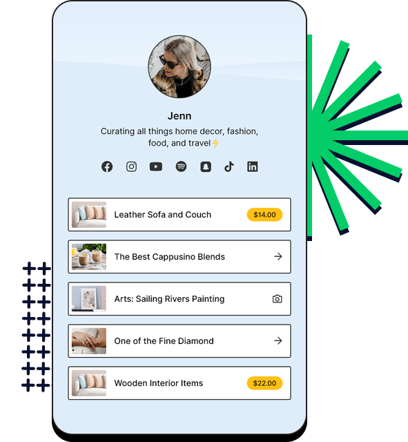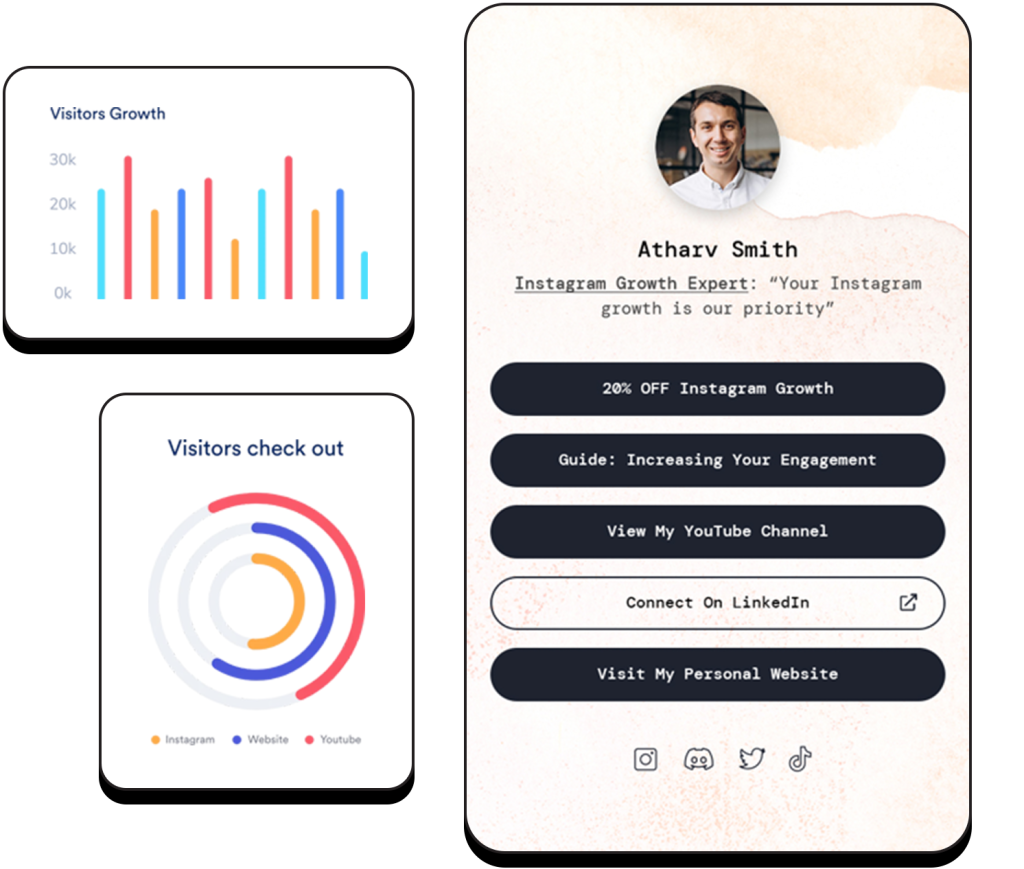 Effortlessly integrate your TikTok, Instagram, Twitter, personal website, online shop, videos, music, podcasts, events, and more. Seamlessly unite all your content under one link-in-bio landing page crafted for maximum conversion.